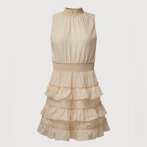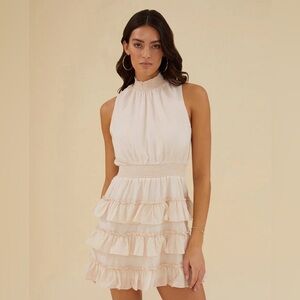 Chic cream dress with ruffle details. Perfect for any occasion. Smocking at the keyhole collar and waist creates definition on this halter dress. It’s made from fully lined rayon voile with a lightly shirred bodice and a miniskirt with ruffles tiers.