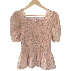 Rachel Parcell square neck smock top in size XS. This blouse features a smocked bodice, short puff sleeves, and a pastel pink floral print.