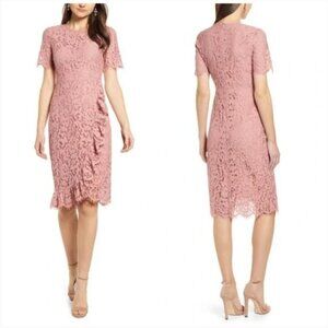 Rich floral lace lavishes a curve-skimming sheath styled with pretty scalloped edges and a soft cascading ruffle for an asymmetrical look. Designed by blogger and style influencer Rachel Parcell