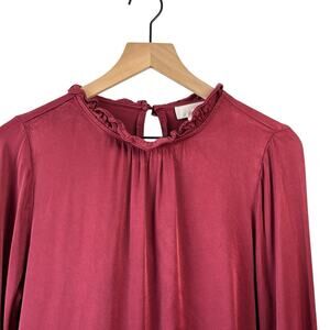 Rachel Parcell Designer Ling Sleeve Blouse. Size Small. Measurements are approximate laying flat: chest is 18” and length is 22”. Beautiful maroon burgundy color. Ruffled neckline and cuffs. Excellent preowned condition with no flaws.