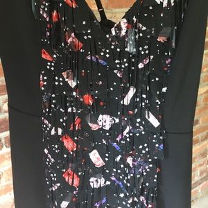Figure flattering pencil dress- black with printed confetti- style fringe on the front panel. Cross- back spaghetti straps. Rachel Roy's signature elastic horizontal back. Cute, flirty, perfect for dancing. Worn once in EUC... No flaws.
