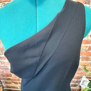 Stunning and sleek one-shoulder evening dress by Rachel Rachel Roy. Features a modern, minimalist silhouette with a fitted column shape and asymmetric neckline. Diagonal seam detailing creates a flattering sculpted look.
