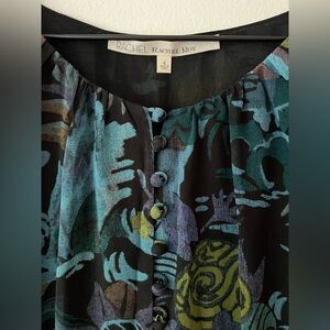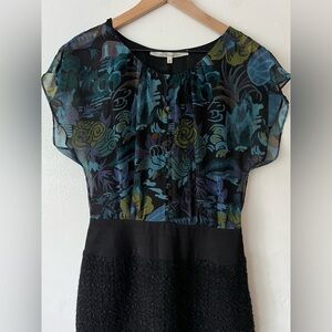 Sophisticated and feminine, this RACHEL Rachel Roy dress features a chic combination of textured black tweed and sheer floral fabric. The bodice includes functional buttons down the front, adding classic detail, while a defined waist creates a flattering silhouette. It has a concealed side zipper for easy wear and is fully lined for comfort and coverage. This dress blends structure and softness beautifully. In excellent condition. *Tagged Anthropology for exposure