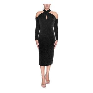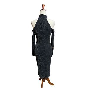 Details: glitter throughout, wrap upper with keyhole neck, long cold shoulder sleeves, built in lining, zip back with hook and eye closure, bodycon, midi