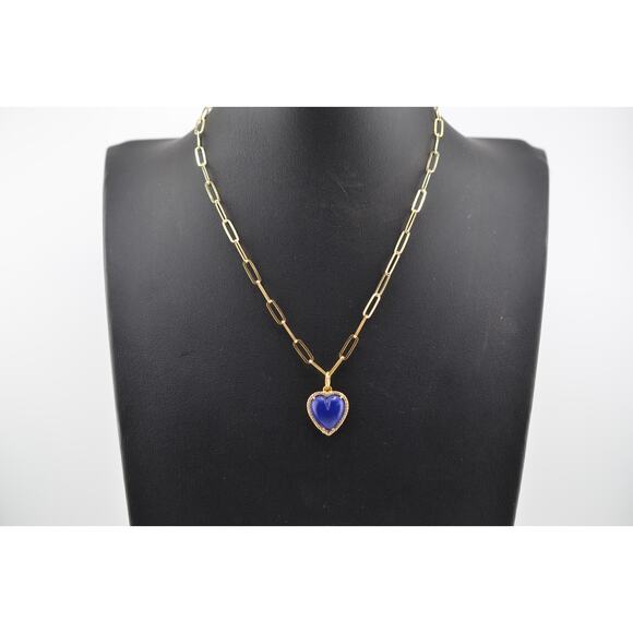 This petite blue lapis heart pendant sparkles with zirconia pavé accents and hangs gracefully on a gold paperclip chain. Perfect for everyday wear or as a thoughtful gift, it blends natural elegance with modern style. Necklace measures 16"+2" extender. Pendant hangs 1". Blue lapis. Zirconia. 14k gold vermeil over sterling silver. Handmade in the USA.