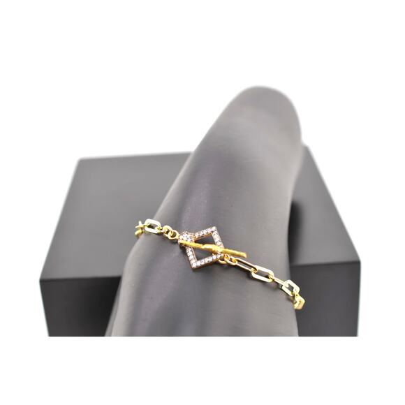 A sparkling pave toggle attaches to a beautiful paperclip chain bracelet. Bracelet Measures 7". 14k gold vermeil. Zirconia pave. Handmade in the USA.