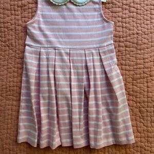 2T pink and white striped sleeveless dress. Buttons in back. Fabric is cotton jersey (95% cotton, 5% elastane). Approximate measurements: chest 22 inches and length 20 inches.