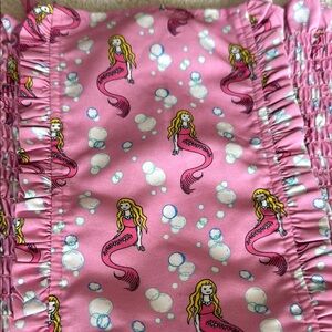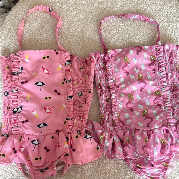 Adorable pink swimsuits with ruffles. Features playful prints of umbrellas, drinks, and mermaids.