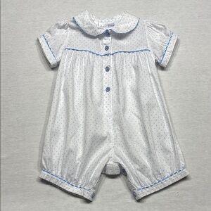 Adorable white baby romper featuring blue polka dots. Short sleeves, rick rack trim, button-up front, and button closure for diaper changes. Manufactured in cotton.