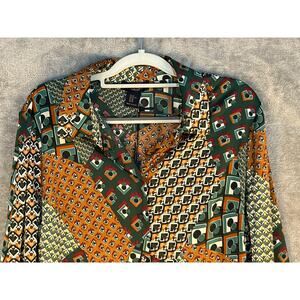 Rachel Roy Blouse XL Green Patchwork Satin Retro Preppy Office NWT