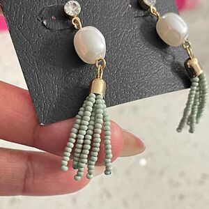 Rachel Roy tassel earrings, Mint beaded earrings, Boho tassel earrings, Rhinestone stud earrings, Faux pearl drop earrings, Lightweight statement earrings, Coastal boho earrings, RACHEL Rachel Roy mint tassel earrings, Boho chic drop earrings, Beachy summer earrings, Spring fashion accessories, Pearl and bead dangle earrings, Coastal glam jewelry, Giftable earrings for her, Mother’s Day jewelry idea, Festival style earrings, Vacation-ready earrings