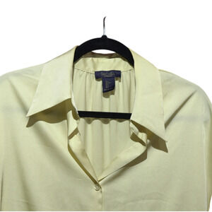 Keywords: Rachel Roy blouse, yellow short sleeve shirt, boxy fit top, recycled polyester blend, women’s size large, button front shirt, office casual blouse
