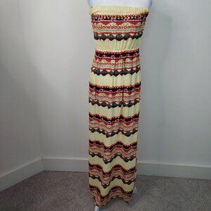Size medium Rachael Roy Claudia Aztec Print Maxi Yellow Dress. 100% rayon. Strapless bodice and elastic waist.  Metal embellishment at bust. Side pockets. Side slits at hem. Pit to pit 13.5" Excellent pre-owned condition