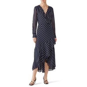 Features: Navy blue base with white stripes throughout long sleeve sheath fit midi dress with faux wrap skirt and loose ruffle hem.