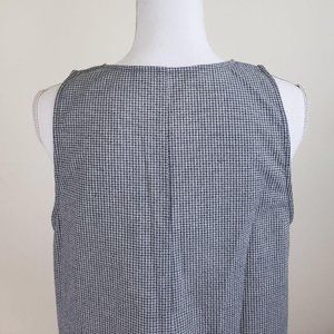 Features: all over black and cream combo geometric pattern, plunged v-neckline, sleeveless. asymmetrical piped trim detail