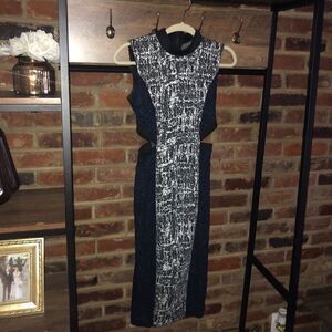 Rachel by Rachel Roy sheath midi dress with cut outs at the waist. Black and blue side panels. White and black “pebbles” tweed like pattern. Dramatic black zip up back. Size 2, measurements in pictures.