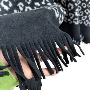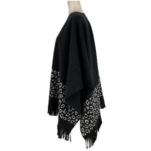 Rachel Roy Fleece Reversible Poncho Black & Ivory Leopard on one side Solid Black on the other side Fringe Bottom