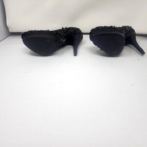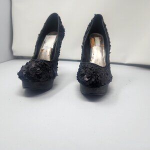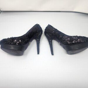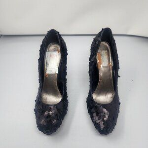 Sexy shoes with a unique 5 inch heel and a 1 inch platform. The insole looks worn, but the outside is in very good condition. The outside of the shoe aren't sparkles, but individual disks attached to the shoe and are much less likely to come off. The brand is Rachel Roy, style name is Keedan if you want to check the reviews.