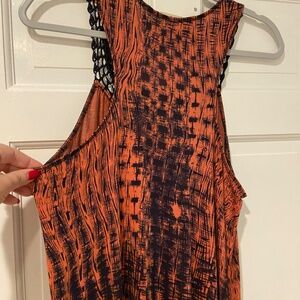 This beautiful Rachel Roy maxi dress in size medium is made from 100% viscose, offering a soft and breathable feel. It features a stunning burnt orange and black color combo, a trendy crocheted collar, and a flattering racerback design. With pockets for added convenience, this dress is perfect for any occasion! The pit-to-pit measurement is 18 inches, providing a comfortable fit. This pre-owned dress is in excellent condition, with no visible flaws.