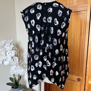 Features asymmetrical hemlines, cap sleeves, Vneck.  Measures 18.5” armpit to armpit (across the front), length is 28” at longest point.