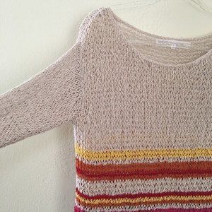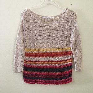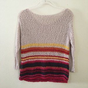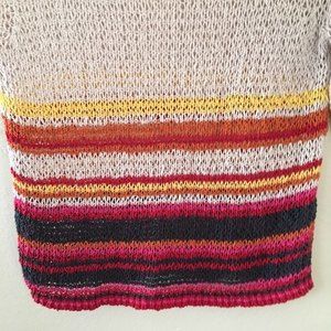 Open knit loose fit sweater in oatmeal can be worn the regular way or wear it draped off one shoulder for variety! The actual yarn it's made from has a bumpiness that gives the top great texture and appeal. Bottom potion is striped in pink, red, yellow, orange and navy blue. In gently used conditon, no flaws!