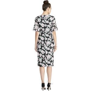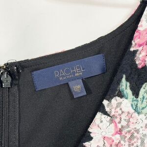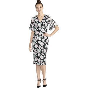 Rachel Roy 20W dress, plus size floral midi dress, black and pink floral dress, V-neck sheath dress, Rachel Roy women’s clothing, flutter sleeve dress, elegant plus size party dress, Rachel Roy floral print dress, sophisticated evening wear 20W, plus size bodycon dress, feminine floral sheath dress, black floral formal dress, plus size cocktail dress, Rachel Roy women’s fashion, chic floral occasion dress.