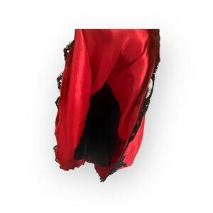Elegant two-piece designer set by Rachel Roy, US size 12. Includes a striking red sleeveless dress with a fitted bodice and flared skirt, finished with dramatic black lace trim at the hem. Comes with a coordinating tailored red jacket featuring black lace accents, button front, and a cinched waist for a polished silhouette.