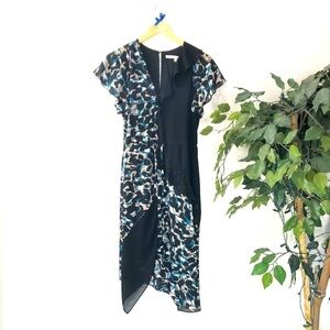 A layered dress with ruffle sleeves and ruffles detailing the front. Working draw strings around the waist and a button on the back. A semi asymmetrical front with a fun almost leopard print design.
