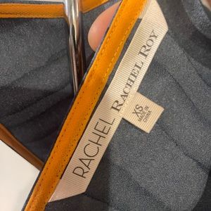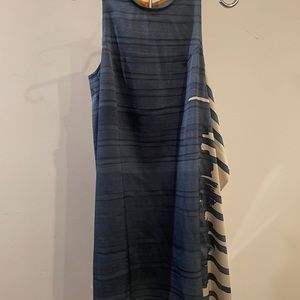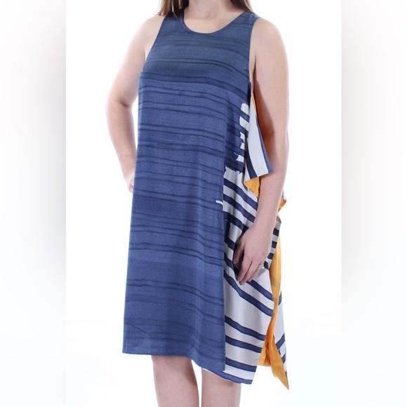 Silky polyester shift dress with striped ruffle. Size extra small, colors - blue white, and gold orange.