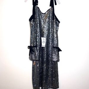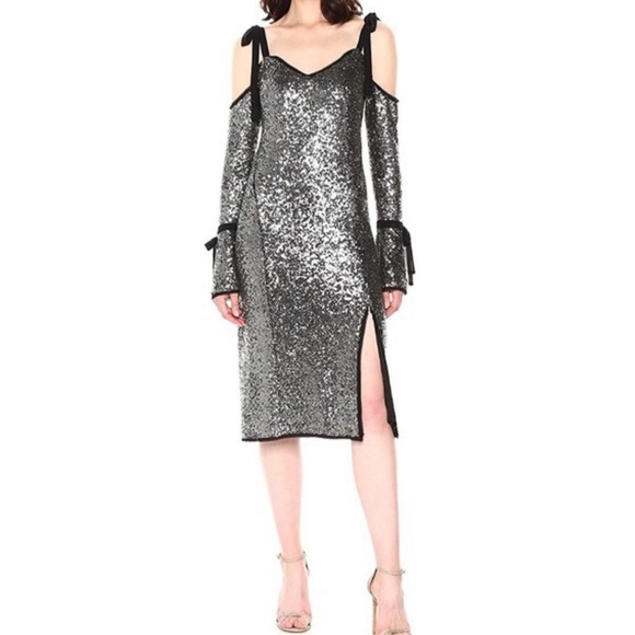⦁ Features: Stake your claim as best dressed party guest in a midi dress spangled with sequins and tied in bows at the shoulders and cuffs. Tie closures at shoulders. Midi length. V-neckline; Sheath silhouette. Long bell sleeves with tie detail. Allover sequins; mesh trim. Slit at front side.