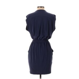 Sleeveless, cowl neckline, sheath, solid, ruched detail, shirring, draping, fold over fabric, drawstring, twist front, blue, work, knee length