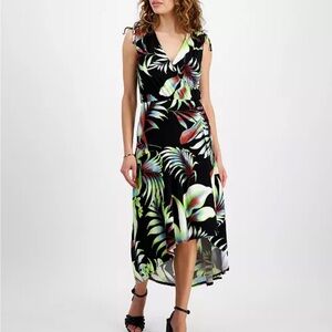 This sleeveless sundress by RACHEL Rachel Roy features a chic v neck and an asymmetrical high-low hemline, perfect for resort wear. The black and white color palette is complemented by a flowing wrap style, making it an elegant choice for cocktail occasions.