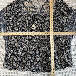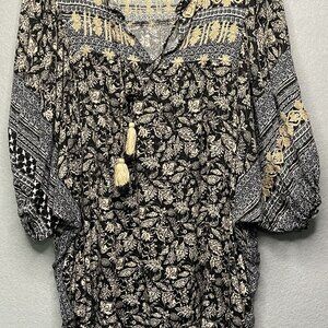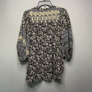 Rachel Roy Womens Boho Blouse Top With Tassels Floral Print Black & Beige S