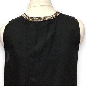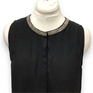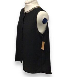 Black, size M, sleeveless crewneck blouse by RACHEL Rachel Roy. Features a button-down design, draped back, and sequin detailing for a blend of casual and dressy style. Ideal for business, party, or cocktail events.