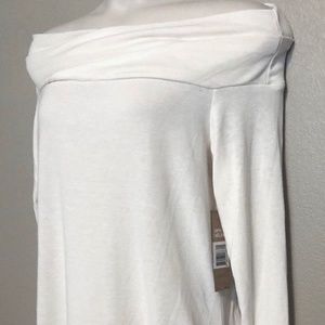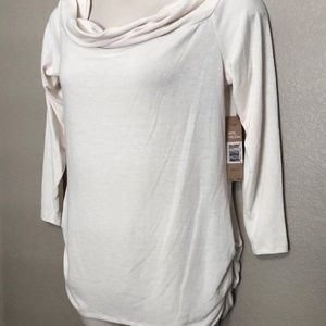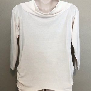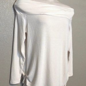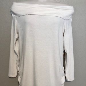 A drapey fold-over neckline can be worn on or off the shoulder to bring on-trend style and timeless allure to a stretch-knit top in a versatile ivory color