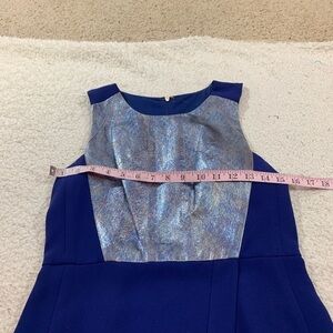 Wide crew neck - Sleeveless - Back zip closure - Metallic leather top bodice detail - Front draped panel - Sheath silhouette -