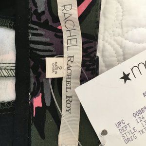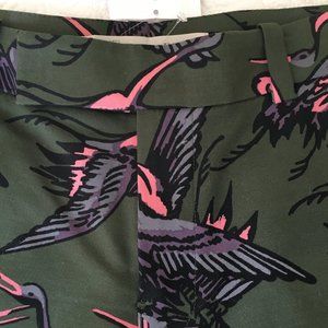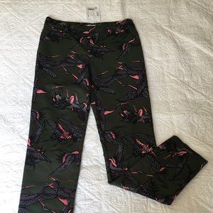 Gorgeous Rachel Roy pants, dark green with a graphic design of birds, colored in pale pink/coral/blue. The pants have a thin waistband, with thin belt loops in matching fabric. The are tailored very well. The material is not flimsy at all, and has a bit of stretch. 97% cotton, 3% elastane. There are small slant pockets in the front, 2 decorative slit pockets on rear. At the ankle hem of each pant is an invisible zipper. The original price was around $99, I paid $53.