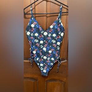Rachel Roy women’s size Large blue floral side Lace up one piece swimsuit