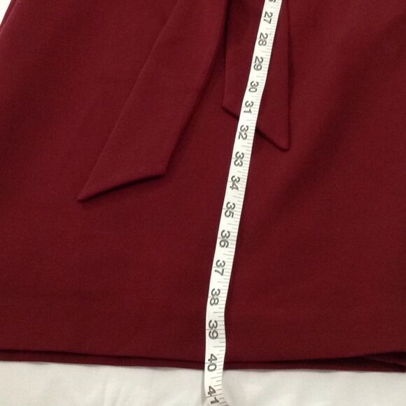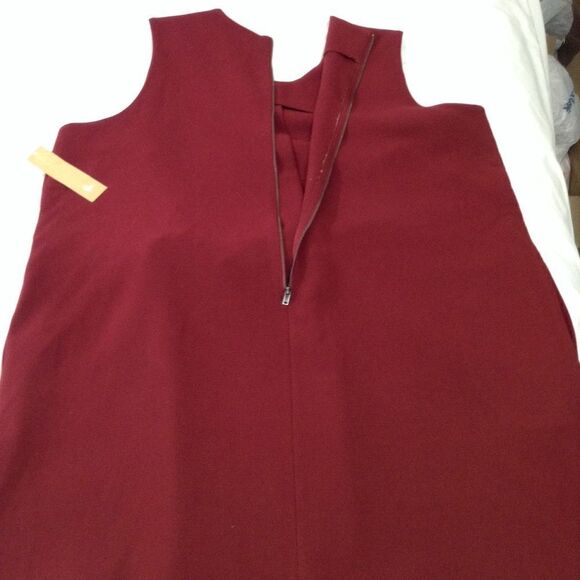 New With Tags, Sleeveless no blemishes, side pockets, side tie belt, front pleat, back zipper, dress is listed as red for a lack of color options, but it's Burgundy