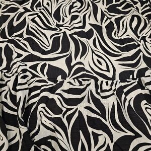 Make a bold statement in this stunning Rachel Zoe two-piece set featuring a unique black and white abstract zebra/leaf print. The set includes a smocked-back cropped tank with wide straps and a matching high-waisted midi skirt with a tiered hem.