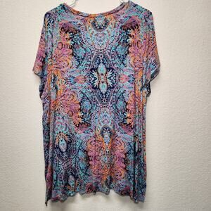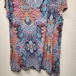 Rachel Zoe 2XL short sleeve Colorful stretch flowy Slouchy top shirt blue orange. Pit to pit 23 inches