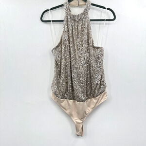 Rachel Zoe Allover Sequin Halter Bodysuit Size L Gold Beige Silver Party Holiday