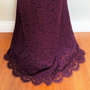 The dress is the "Angie" open back long sleeved gown in "Fig" purple cotton blend lace. It has an unlined yoke and sleeves, but the rest of the dress is fully lined. It has an open back with a hook and eye closure at the top and a back zipper closure. It has beautiful scalloped edges at the open back, cuffs, and hem. It has a slight flare at the bottom of the skirt and a front slit for movement and elegance. Retail $525.