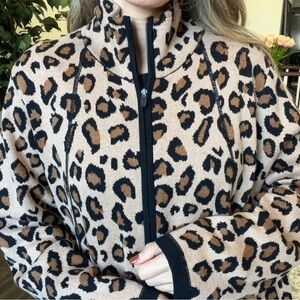 Beautiful and warm longline sip up animal print cardigan. Mock neck, side pockets.