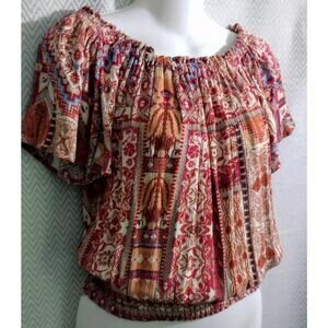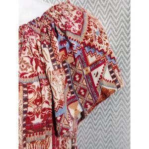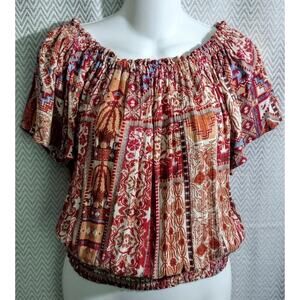 Rachel Zoe Banded Peasant Winch Top Orange Brown Print Floral Batik Aztec M