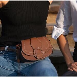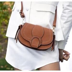This chic saddle brown purse is brand new with tags and features an adjustable strap, allowing you to wear it as a crossbody or around your waist.