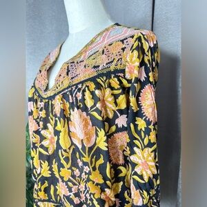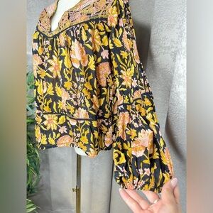 Rachel Zoe Black Floral V-Neck Embroidered Peasant Bohemian Blouse Sz XS