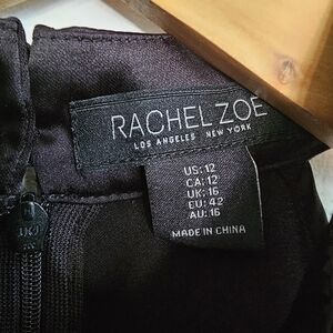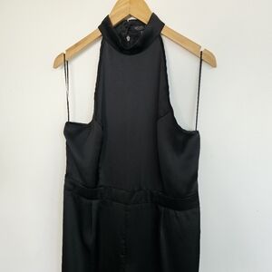 Rachel Zoe black satin jumpsuit with halter neck, wide leg, and back zipper and buttons.