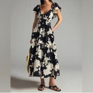 Rachel Zoe Black and Cream Floral Flutter Sleeve Tiered Maxi Dress Size XL