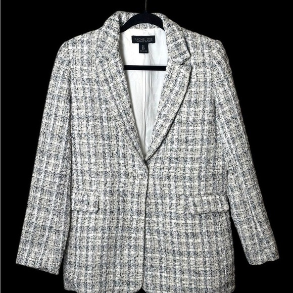 This Rachel Zoe blazer features a classic black and white woven pattern, offering a timeless and sophisticated look. Crafted with a textured fabric, it showcases a notched lapel collar and structured shoulders for a polished appearance. The slightly oversized silhouette adds a modern twist to this elegant piece.